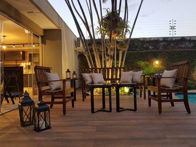 Área externa da piscina projetada ao lado do café ACROCHA. Ambiente perfeito para realizar os tratamento ao ar livre enquanto aproveita o café.